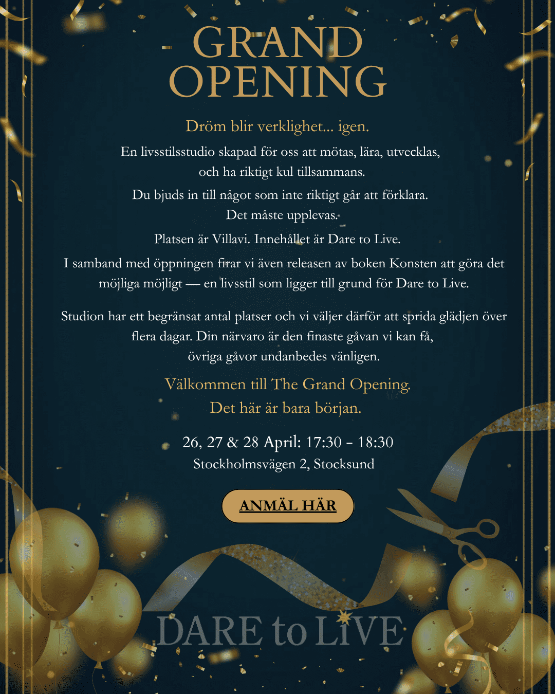 Under tre timmar kliver du in i Dare to Live-filosofin och börjar träna det som skapar utveckling över tid: medvetenhet, balans och mod. Workshopen fungerar som ett första konkret steg in i livsstilen – där förståelse omsätts i handling.